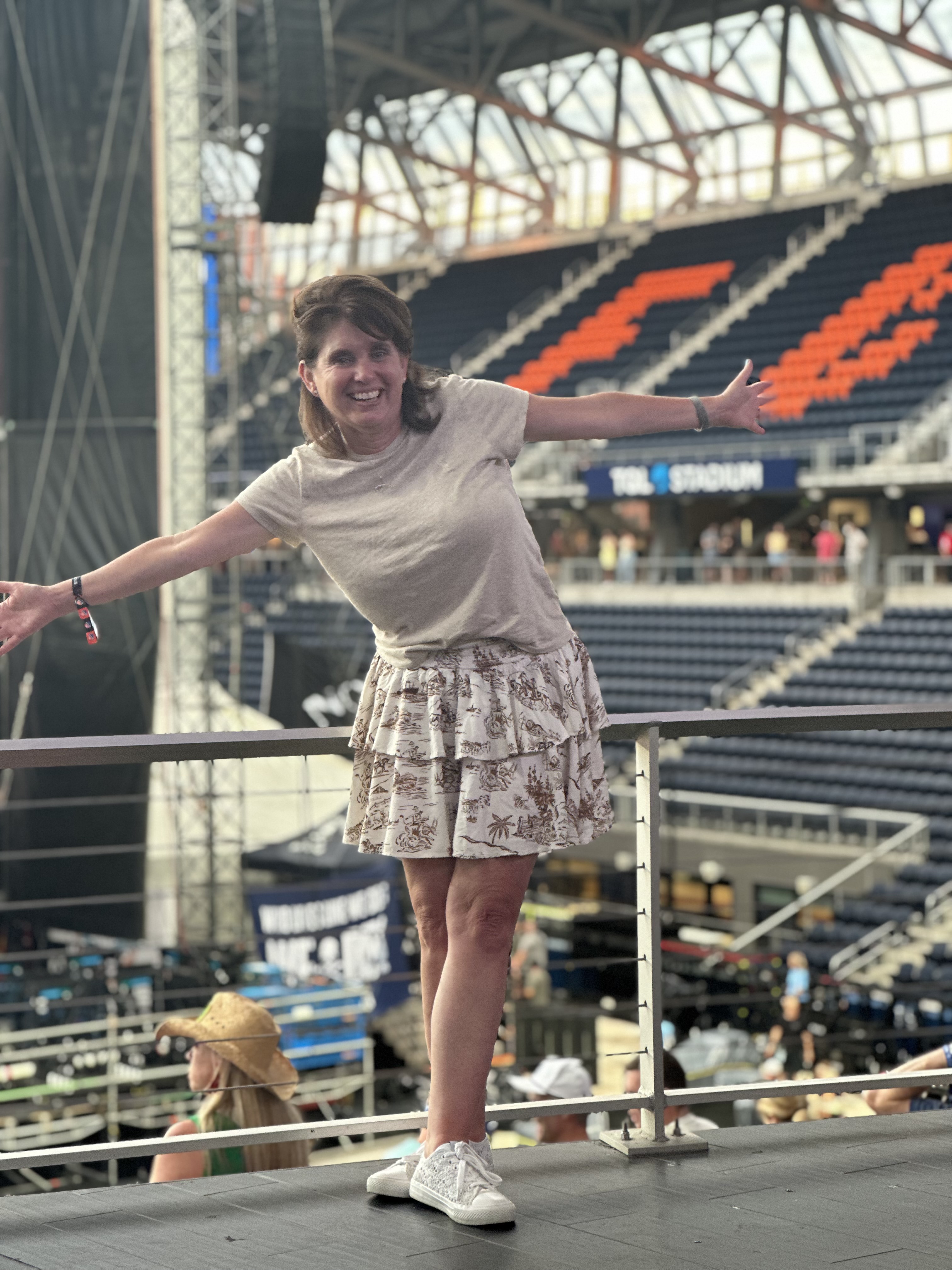 The venue was perfect, I happen to purchase Club Level seats which not only offered us restroom and bar access, but a terrace of patio furniture that ended up being our seats for the night.  So much of the evening flooded my mind with memories of the years in the business and how every night is a new adventure, challenge to tackle and tunes to sing along.  Case in point we had a small weather delay, as I witness the staff ushering the concert goers off the floor for a brief stay under cover, I thought this place has great customer service.  Opening additional concession stands, offering seating in a “dead” space behind the stage, and giving frequent updates, you could easily tell this wasn’t their first rodeo.  As a crew member climbed to the top the stage roof to “sweep” off the accumulation of water, I was mesmerized of his lack of fear and the show must go on attitude.  Our resident usher Roger had worked the area for many years and told us to stay in our lounge chairs as our location was perfect.  Finally, Megan Moroney came out as cute as a button, blonde hair blowing, and smile as bright as the peach dress she was wearing.  She made it through one song when she announced that her white cowboy boots weren’t cutting in on the wet stage floor and decided to go barefoot for the remainder of her set. The No Shoes Nation attitude was alive and well to kick off the evening.