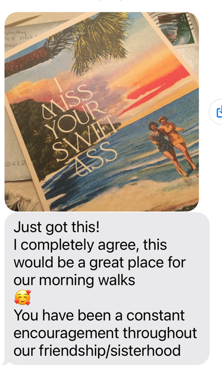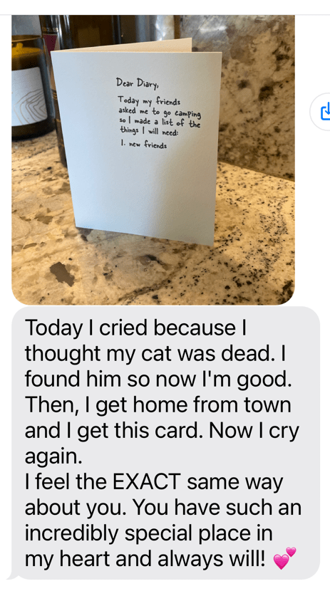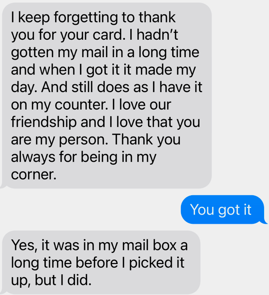 My first response arrived via a text six days later.  As expected, Serena, not only was the first to respond, but delivered a sweet text complete with a photo of the card.  The outcome of the rest of the experiment was truly up for grabs.  Life and work events, punctuality of getting daily mail and communication styles made the guessing game ridiculously hard to call.  Low and behold, the text sound chimed three days later.  Shawna, my best friend since first grade, received her handwritten note.  Brandy text a few days later with a sweet thank you and Tisha called which turned into one of our hour-long chats.   (I have shared all their responses for your enjoyment, hopefully they grant me this latitude.)