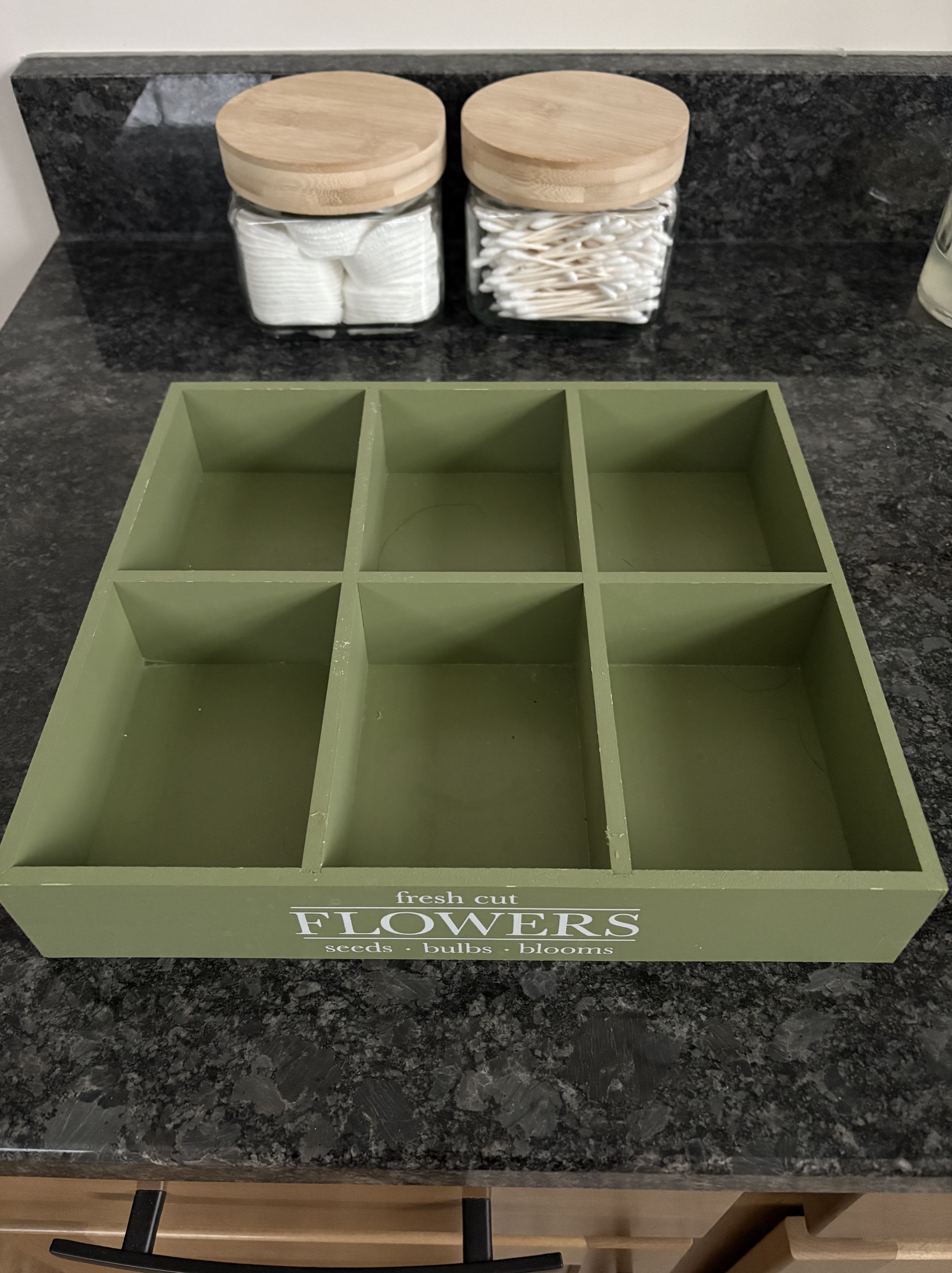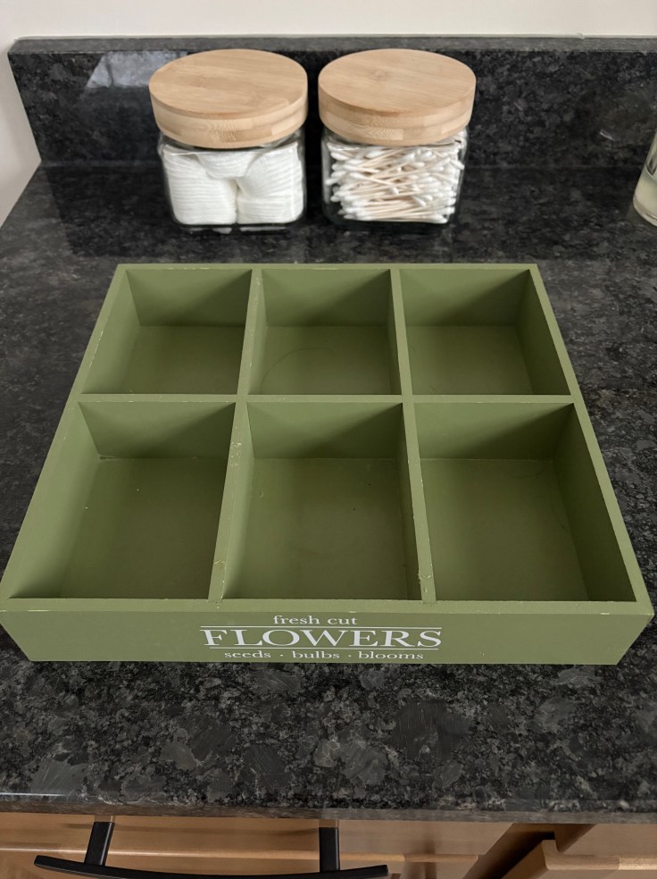 Example – One of my favorites and most versatile pieces in a little green box found on the entry shelves when walking into Target.  A spring time décor piece,  the six compartment, wooden treasure cost a whopping $3 and fits perfect in a bathroom drawer to house make-up.